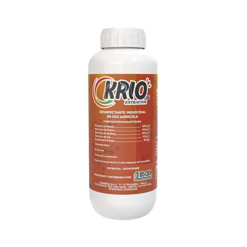 KRIO sc es un Insecticida natural formulado con extractos vegetales como Neem, Piretro, Quillay, Ají, y Aceite de Karanja de uso agrícola, para el control de de plagas en cualquier etapa del cultivo.